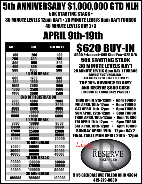 Come celebrate 5 years of Amazing events with us. April 9-19th We are offering a $1,000,000 GTD with satellites as low as $70!