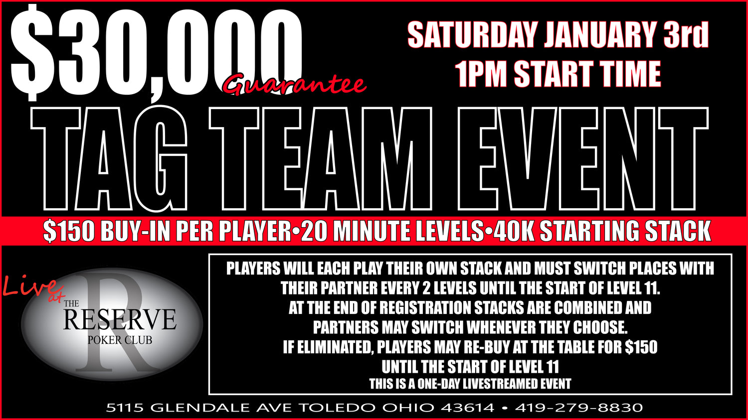 - We are now Livestreaming Tuesday's RUMBLE AT THE RESERVE $5/$10 NLH, Thursday's NO NIT THURSDAY $2/$5 NLH, and Saturday's REGULAR JOE POKER SHOW $1/$3 NLH. If you are interested In playing on our livestream, please send us an email or a Facebook message.