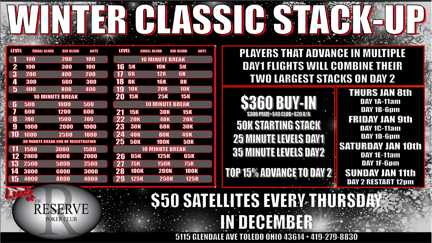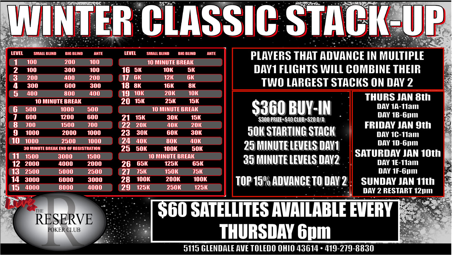 Download our app to see all of the upcoming events and Promotions. You can also see the Clock for the tournaments that are running.